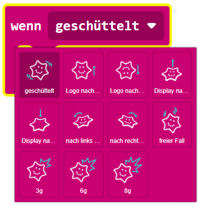 - 3g / 6g / 8g: Diese Einstellung lässt den Calliope auf verschiedene Beschleunigungsstufen reagieren, die durch Schütteln oder eine schnelle Bewegung des Geräts ausgelöst werden. Zum Beispiel könnte der Calliope bei einer stärkeren Bewegung (z. B. 6g oder 8g) eine stärkere Reaktion zeigen, wie das Starten eines Spiels oder das Aktivieren eines besonderen Effekts.