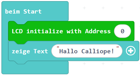 Jetzt gibt es neue Blöcke in MakeCode, mit denen wir Text auf das Display schreiben können. Warum? Die Erweiterung sagt dem Calliope genau, wie er die I²C-Daten ans Display schicken muss.